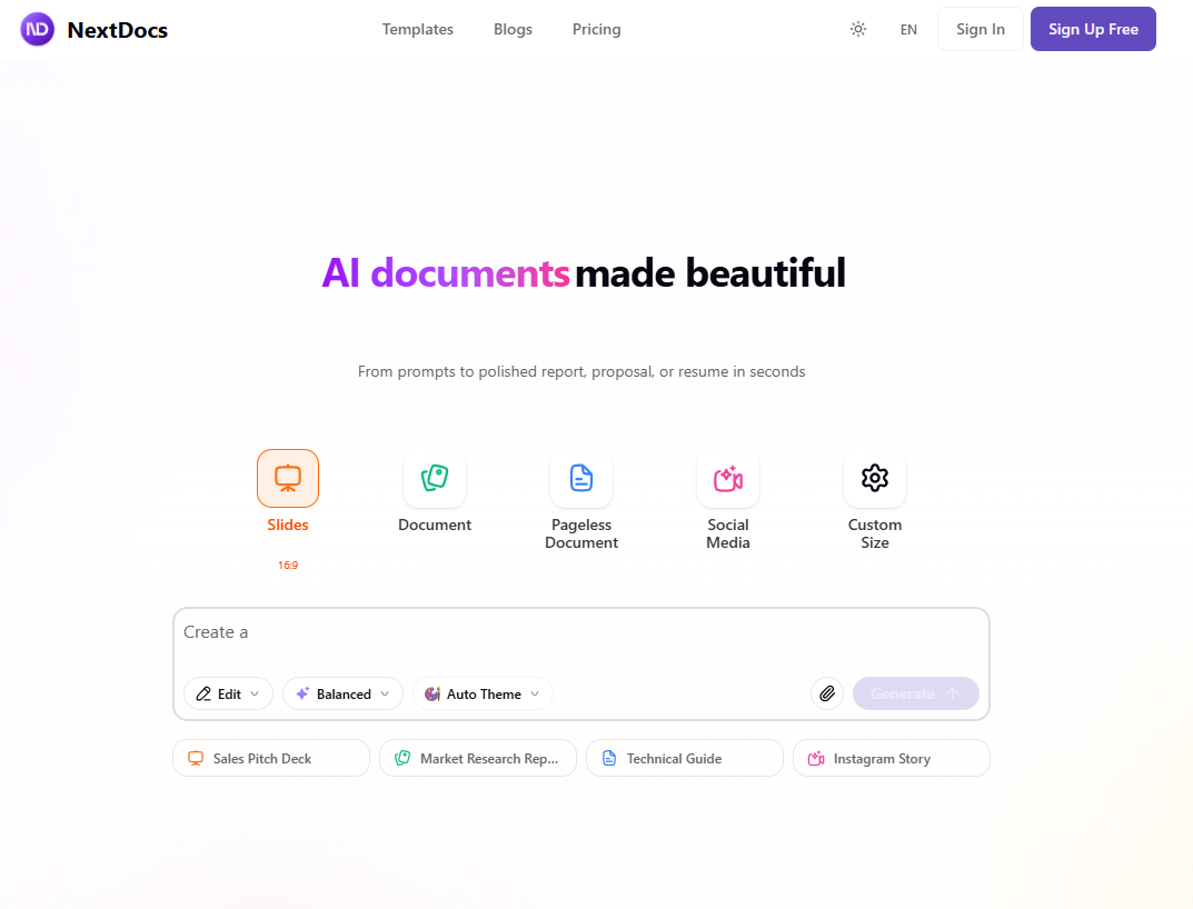 For entrepreneurs and sales teams, creating a compelling pitch deck or business proposal is crucial. Is NextDocs.io suitable for making pitch decks or business presentations? Absolutely. The platform is specifically designed to help you produce these high-stakes documents quickly and efficiently, with AI-powered templates that give you a professional starting point.